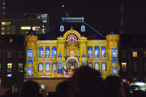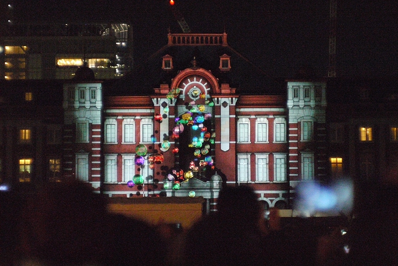 2012年東京駅が復元した。辰野金吾の名建築が蘇ったのだ。それを記念してイルミネーション「トウキョウ ヒカリビジョン」がクリスマス前夜に行われた。この写真は12月22日に撮影した。あまりの人出に、23日からは中止になってしまった。我々は最後の観客だったのかも。 |