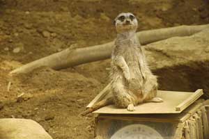 | ミーアキャット なんとも不思議な生き物だ。マングースの仲間でかわいらしい姿からは想像出来ないが、 肉食でヘビやサソリが大好物なんだそうだ。動物界のちびっ子ギャングだという。 |