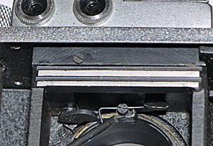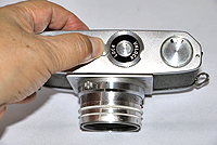 | 2重像合致式の連動距離計は正確だ。変わっているのは、シャッターチャージのメカが、レンズ鏡胴の表から見えるようになっていて、単純な仕掛けに思わず笑ってしまう。巻き上げレバーを1回まわすとチャージレバーを下に押し下げ、もう一度回すとシャッターがチャージされる。つまりシャッターを切るためには、2回のレバー動作が必要になる。 |