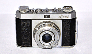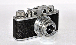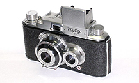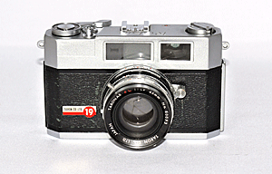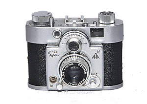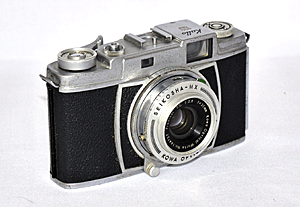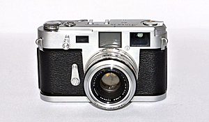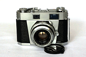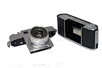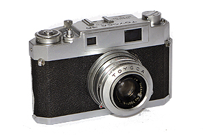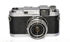 昔から気になっていたカメラだ。S型ニコンをコンパクトにしたようなデザインは、かなり魅力的である。連動距離計付の1眼ファインダー、2回巻き上げのセルフコッキング、シャッターはBから1/300までの自社製レンズシャッター、奇をてらわずに手堅くまとめている。 販売価格は12,250円。 |