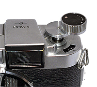 | 巻き上げは2回レバーを操作する。2回目にシャッターがセットされて、シャッターボタンが上に飛び出し、セット完了の赤いマークが現れる。レバーの感触が、何となく頼りないのが気になるところだ。 |
