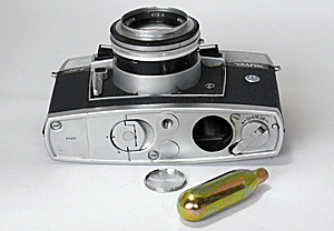 ガスボンベ1本で24枚撮りフィルムを6本ほど撮影できた。巻上速度は1秒に2コマだったらしい。ピント合わせは全面レバーで、フィルム面を前後させるバックフォーカシングで、これも日本のマミヤぐらいしか例を見ない珍しいメカだ。設計者はよほどの変わり者だった思われる。 壊れやすかったのも事実のようで、わずか2年で生産が打ち切られた。このカメラも自動巻き上げユニットは取り外されていた。シャッターレリーズはセルフタイマーのように見えるレバーで行う。 |