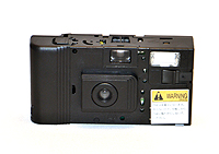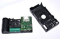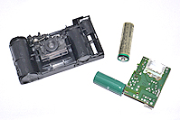 | 撮りっきりコニカミニから小型パトローネを取り出すために、カメラを分解してみた。ストロボのために高圧電流が流れるので、感電に十分注意して慎重に分解する。 |