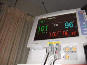 | 常時心機能監視モニター 血圧78−116。心拍数101。 酸素供給96。 |