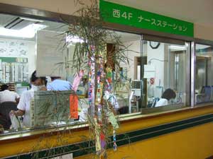 | 一般病棟のナースステーション 1週間ICUにいて一般病棟に移された。 七夕飾りには早く良くなりますようにと 願うたんざくがたくさん。 |