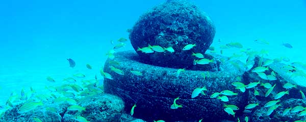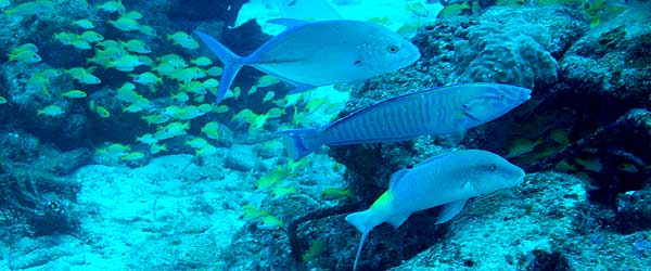 | 水深20メートルの魚礁 翌日25日9時30分、いつものネイチャー石垣島ダイビングサービスの多羅尾さんのガイドで、水深20メートルの魚礁へ潜った。古タイアのまわりに無数のヨスジフエダイが群れていた。 |