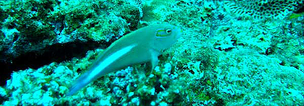 | メガネゴンベ まるで何かを睨み付けているみたいだ。目の後ろにU字型の隈取りが目につく。 |