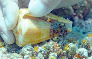 | マクロ派の撮影 一緒に潜ったMさんはガリガリのマクロ派。振り袖エビを見つけてこの通り。 |