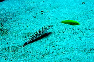 | こちらも私の苦手な被写体。ハタタテハゼだ。中層を泳ぐのは珍しい。 それを、サザナミハギがじっと見ていた。 |