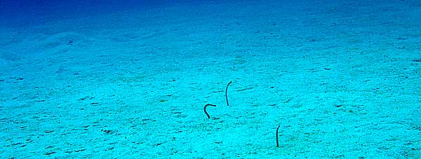 | チンアナゴ 真っ白い砂地から、ニョキニョキと顔を出すチンアナゴ。 ちょっとでもこちらに気づくとすぐ潜ってしまう。これまで失敗続きだった。 この写真が撮れただけでも、私のスキルがだいぶ上がってきた証拠だ。 |