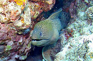| ウツボ 見るからに獰猛そうな顔。 でも、かなり近づいても動かなかった。 |