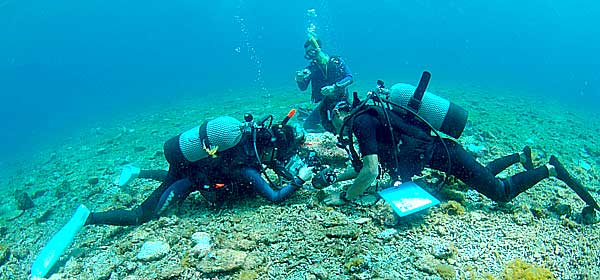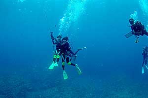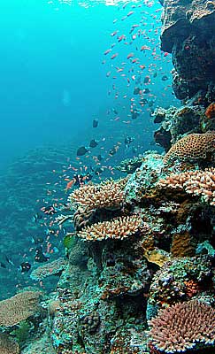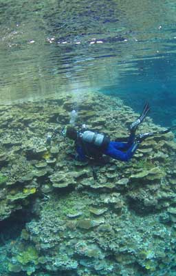 | 癒しの空間 (左の写真マリンフォト誌’07年10月号入選) 浅場の珊瑚礁は日の光を浴びて美しい。身も心も癒される空間だ。 一緒に潜った三島さんも気持ちよさそう。 |