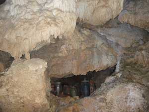 | サビチ鍾乳洞 3億7千万年前に海底から隆起したといわれる。向こう側の出口は海である。 洞中には洗骨後の遺骨を納める厨子瓶(ジーシガーミ)がたくさん展示してある。 |