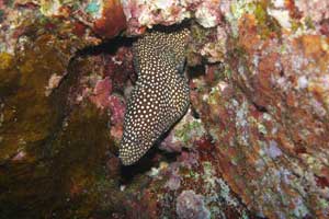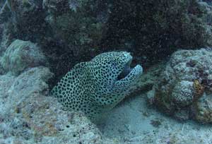 ハナビラウツボ こちらは川平湾にいたハナビラウツボ。 斑点などはよく似ているが、体色がだいぶ 異なる。身体も小型で左の半分ぐらいか。 |
