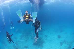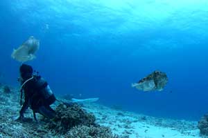 ダイバーとコブシメ のんびりと近づいてくる。かなり大きい。 |