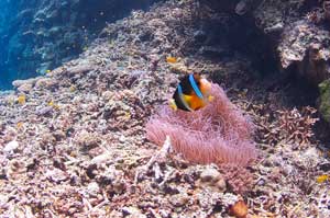 | クマノミ 左は褐虫藻が戻ってきて、ピンク色になったイソギンチャクと暮らすクマノミ。 右は座布団のようなハタゴイソギンチャクと共生するクマノミ。 |
