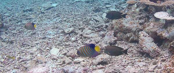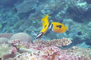 | ニシキヤッコとサザナミハギ 鮮やかな黄色と青の縞模様。背びれに青い眼状斑がある。ニシキヤッコだ。 うしろから付いていくのはサザナミハギ。こちらは地味そのもの。 |