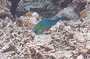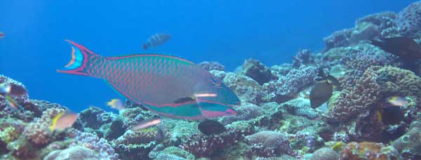 | イロブダイ 80センチほどの大型のブダイだ。幼魚は赤筋の入った白い魚体で 親とは似ても似つかぬ愛らしい姿をしているという。 |