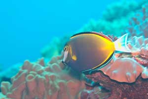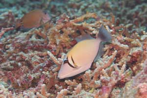 | オオモンハゲブダイ 目から胸びれにかけた三角の 黄色い斑紋が特徴。 |