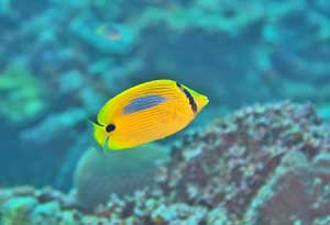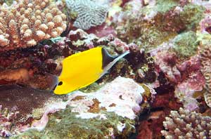 フエヤッコダイ とがった口吻と、鮮やかな黄色が 青い海の中で独特の存在感がある |