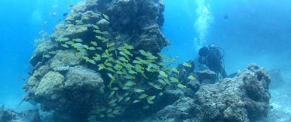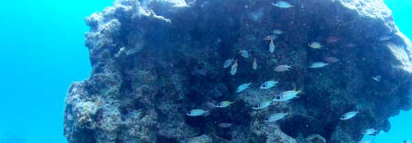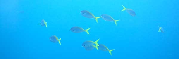 | イッセンタカサゴ 小型のタカサゴが群れていた。タカサゴ類は沖縄ではみんなグルクンと呼ばれる。 真っ青な海の中を進む、銀色の群れは神秘的である。 |