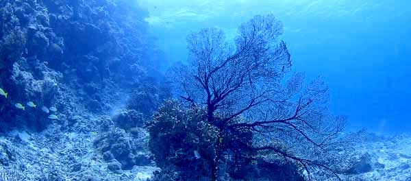 | コモンシクロサンゴの根 (マリンフォト誌2008年11月号入選) 波浪注意報が嘘のような穏やかな海。平均水深11メートル。 ヨスジフエダイがゆったりと出迎えてくれた。 |