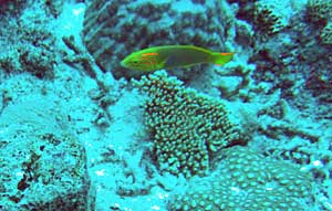 | クレナイニセスズメ 岩陰に小さな魚が潜んでいた。クレナイニセスズメだ。糸山さんがライトで照らすと ネオンのように輝いた。不思議な魚だ。それにしてもなんでニセというのだろうか。 |