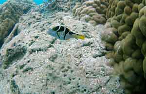| シマキンチャクフグ 岩陰から出てきた。モンガラだと思ったけど 多羅尾さんにフグだよと教えてもらった。 |