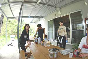 | これから体験ダイブ 現役ナースの二人は、体験ダイブだって。 中央はガイド役の糸山君。 体験ダイブとは思えない潜りっぷりに 一同驚愕。右端の青木さんが 切れちゃった。ごめん。 |