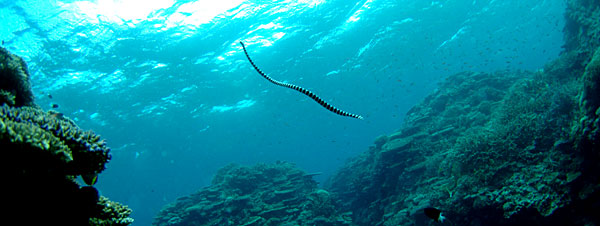 | ウミヘビ PENTAX *istD DA10-17fish-eye 10mm F6.7 1/250sec ウミヘビには昼行性の種と夜行性の種とがあるそうだ。夜行性のものには沖縄で エラブーとかイラブーとか呼ばれるコブラ科の毒蛇がいる。毒はコブラの10倍という から大変に危険な種だ。しかも魚類ではなく爬虫類だ。 この写真のウミヘビ、図鑑で見ると、この毒蛇にそっくりなのでびっくりしたが、 これは昼行性のシマウミヘビという種で毒は無いらしい。ウナギやウツボの仲間で こちらは歴とした魚類だ。 ちなみに毒蛇のエラブーは、漢方薬として珍重され、丸ごと一匹を燻製にしたものは 1万7千円で売られていた。 |
