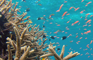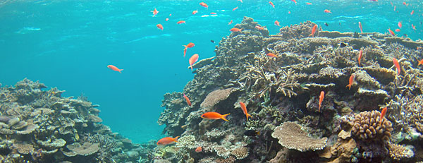 | キンギョハナダイ PENTAX *istD DA10-17fish-eye 10mm F6.7 1/125sec 無数のキンギョハナダイの群れ。その名もハナダイリーフ。 私のお気に入りのスポットである。 |