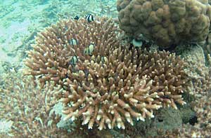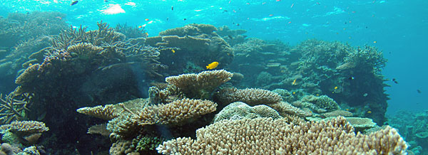 | 広大な珊瑚礁とネッタイスズメダイ PENTAX *istD DA10-17fish-eye 10mm F5.6 1/125sec 透明度25Mの石垣の海。美しい珊瑚礁が果てしなく続く。 ネッタイスズメダイの鮮やかな黄色が印象的だ。 |
