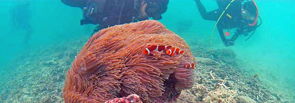 | カクレクマノミ 最終日の4日は波が高く、外海に出られないので湾内で潜った。 海の中もうねりがきつくて、カメラはなかなか安定しない。 |