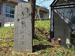 | 西の城貝塚の碑と断面 日本最古の貝塚の断面を見ることが出来る。今から9千5百年前の縄文早期初頭の地層だ。ヤマトシジミなどの淡水産の貝が主体だが、ハマグリやカキなども出土する。土器は井草式、夏島式など撚り糸文系初期の土器が大部分を占める。 |