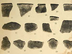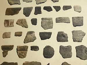 | 出土土器の破片 残念ながら現物は展示されていない。早稲田大学西村教授をリーダーに発掘調査された。 |