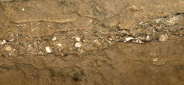 | 貝塚の地層 地層の回廊の中に、貝塚の地層の実物大の模型がある。このように埋まっていた。 今から4千5百年前に始まる縄文後期の地層である。 |