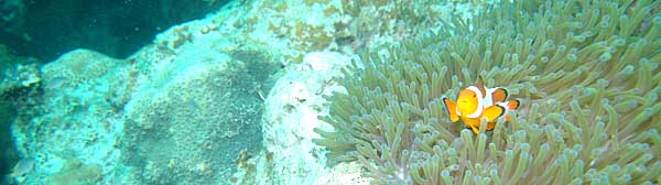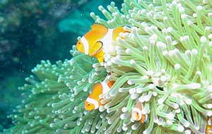 | カクレクマノミ イソギンチャクにはカクレクマノミが棲んでいる。人気の被写体だ。 イソギンチャクは触手に棘があって、小魚を痺れさせて補食するが クマノミは平気で出たり入ったりしている。不思議だなあ。 |