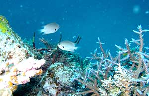 珊瑚礁にたくさんいた。ネッタイスズメダイ