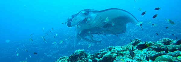 | マンタの友達(マリンフォト誌’05.11月号入選) クリーニングするホンソメワケベラ、マンタの体にくっついて無精してるコバンザメのほか たくさんの小魚を引き連れて、まるでガキ大将だ。 |