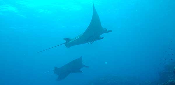 | 2連のマンタ この2枚のマンタは恋人同士だろうか。ヒレを広げると5メートルにも達する。 世界最大のエイだ。 PENTAX *istD F8 1/150 ISO200 16mm |