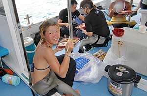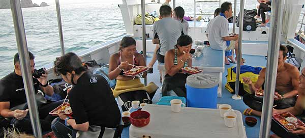 | みんなで食事 ダイビングの間に船の上で弁当。船上の食事は苦手だった。若い連中の食欲はすごい。 |