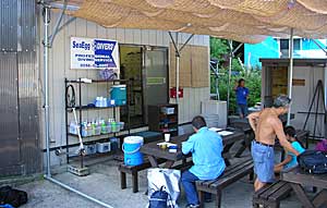 田子のショップはSeaEgg DIVERSだ。青木さんお気に入りのショップで、 2ボートダイブで1万円は安い。初心者や高齢者に優しいガイドも嬉しい。 黒犬のタンクが出迎えてくれる。ベランダも含めて広いコーナーで、食事も ログ付けも楽しい。海底地図着きのログは、このショップ自慢のサービスだ。 沼津から修善寺道路を経て1時間で着く。 |