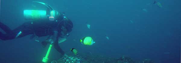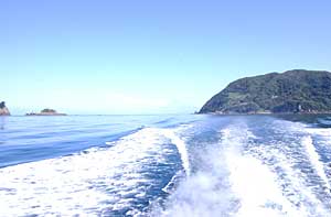 | 私の20本目の記念ダイブは、西伊豆の田子ということになった。いつもの青木、元木の両氏に、青木さんの愛娘絵麗奈チャンとの4人で、田子はSeaeggの吉田さんのガイドである。 2005年9月17日(土)、伊豆は快晴で風もなく、穏やかな秋の日であった。気温27度、水温22度。黒潮の流れ込みが少なく、去年より5度も冷たいという。 |