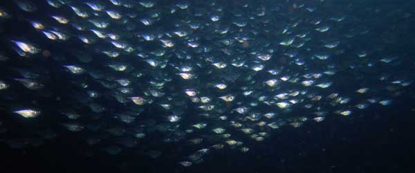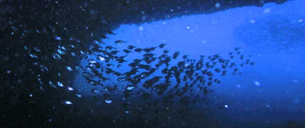 | ハタンポの大行進 ハタンポの大群が、洞窟の中へ吸い込まれるように入ってくる。 ハタンポはスズキ科に属する体長6pほどの小型の魚で、夜行性。大群を作る。 |