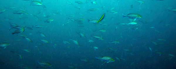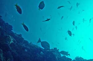 | タカベとイサキの大群 岩礁の回りにタカベやイサキの大群が群舞している。 群れのまっただ中へ入って、一緒に泳いだ。これは楽しかった。 ただし、写真は大失敗。まったく光がまわっていない。研究課題だ。 |