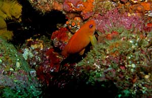 | キンギョハナダイ 岩礁の割れ目から、ちょこっと顔を出した。 |