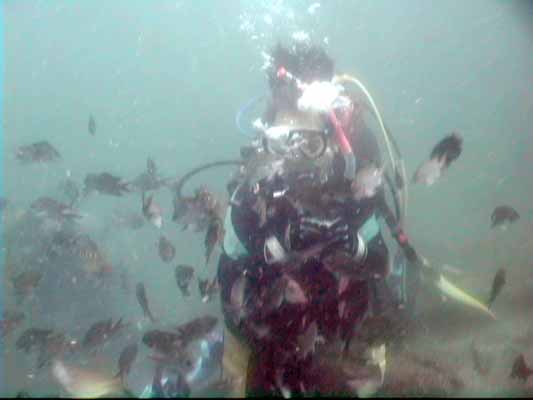 | 初めての体験ダイビング。 最初からご覧の通りのモテモテぶり。こんなに魚がいるなんてびっくり!! この写真は同行の青木社長のビデオカメラから、、、 |