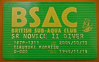 | BSACのライセンスカード いわゆるCカードだ。 スキューバダイビングは基本的なスキルを身につける 講習を受けて、それを証明するCカードを取得しなけれ ばならない。Cカードを発行する団体は、世界中にたく さんあるが、アメリカのPADI、イギリスのBSACが 双璧だろう。 私が取得したBSACは、イギリスのチャールス皇太子 が名誉総裁をつとめている。 |