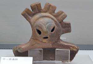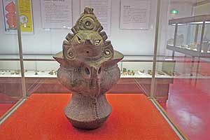 | 仮面の女神 中っ原遺跡から出土した中空の土偶。 国の重要文化財だ。 |