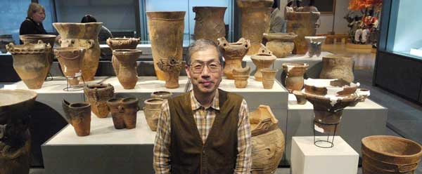 | 縄文人は土器に、人やカエルやイノシシの顔を貼り付けた。なんの意味があったのだろう。それにしてもよく見ると、どれも表情がとっても豊かだ。左の深鉢は国の重要文化財である。 | |